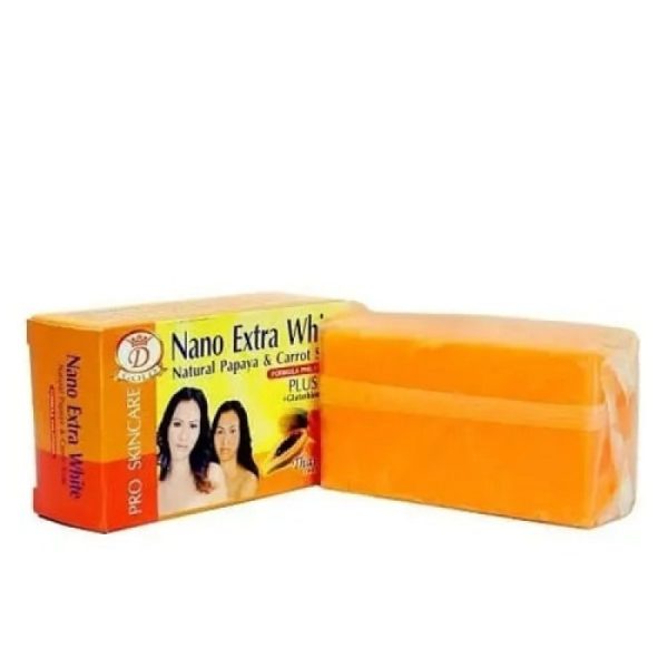 Nano Extra White Natural Papaya and Carrot Soap plus glutathione is one of the best skin lightening and brightening soap. It is a skin exfoliating soap that removes freckles, scars, blemishes and dead skin cells from the body.