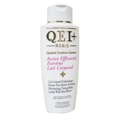 Qei+ Paris Active Efficacite Extreme Lait Moisturizing Toning Body Loton With Shea Butter Has Elaborated A Moisturizing Body Milk with Shea Butter, Especially Developed for Black and Mixed Skins. This New Complex Based on The Best Plants Active Extracts Makes It Very Effective In Toning and Fading Dark Spots, For Treatment Of Scars, Sun Blemishes, Ageing Spots, Pregnancy Blemishes