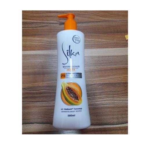 Pamper your skin with the richness of Papaya lightening Lotion. Silka Papaya Lotion contains natural papaya extract that lifts off dead skin cells for clearer, younger-looking complexion, blended with Lipid Layer Enhancer to protect your skin from environmental hazards. Enriched with Vitamin E for improved softness, smoothness and resiliency. Contains sunscreen to protect against damaging effects of UV rays
